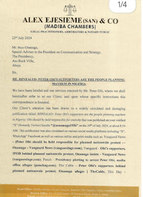Peter Obi's legal team recently issued a statement demanding that Onanuga, a well-known media personality and presidential aide, issue a public apology. According to Obi, Onanuga made several defamatory statements about him that could potentially harm his reputation. These remarks, which have not been fully disclosed to the public, allegedly targeted Obi's character and integrity, raising serious concerns regarding his public image.